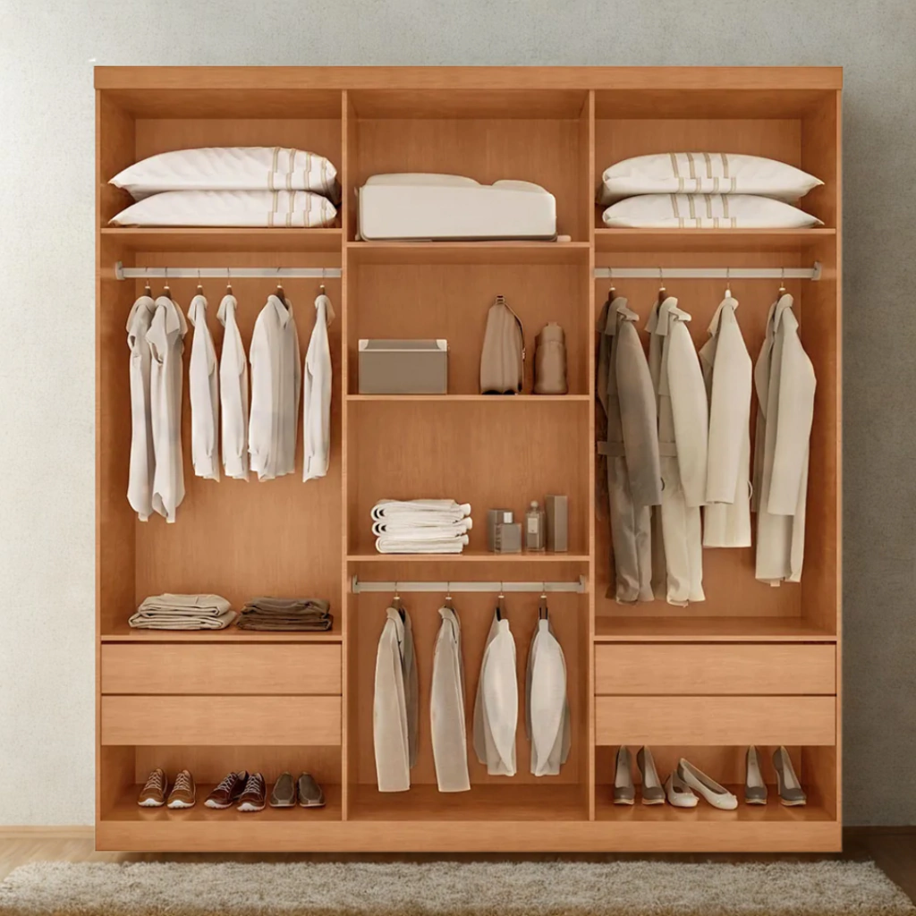 Produzido em MDF de alta densidade, o Armário Opala oferece excelente resistência e estabilidade, garantindo longa vida útil. O interior é amplo e bem distribuído, com prateleiras, cabideiros e gavetas espaçosas que facilitam a organização de roupas, calçados e acessórios.