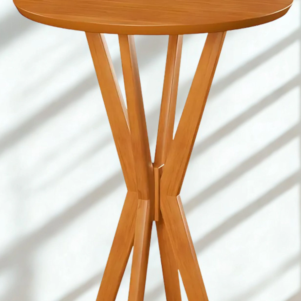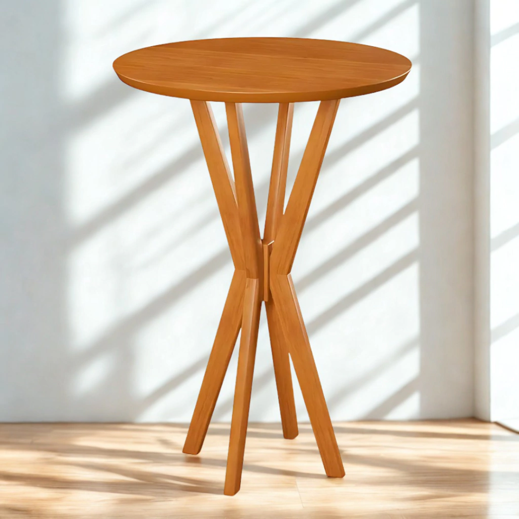 O tampo redondo de 72 cm possui acabamento em verniz UV, que protege e destaca o tom amadeirado, além das bordas em PU que garantem um visual moderno e refinado. A estrutura em madeira maciça traz robustez e durabilidade, ideal para o uso no dia a dia.