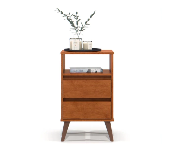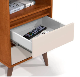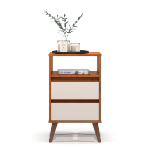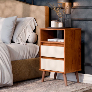 Possui duas gavetas espaçosas que garantem praticidade no dia a dia, perfeitas para guardar livros, acessórios, eletrônicos ou itens de uso pessoal. Seu tampo pode ser utilizado para apoiar luminárias, vasos decorativos ou o que mais complementar a decoração do ambiente.