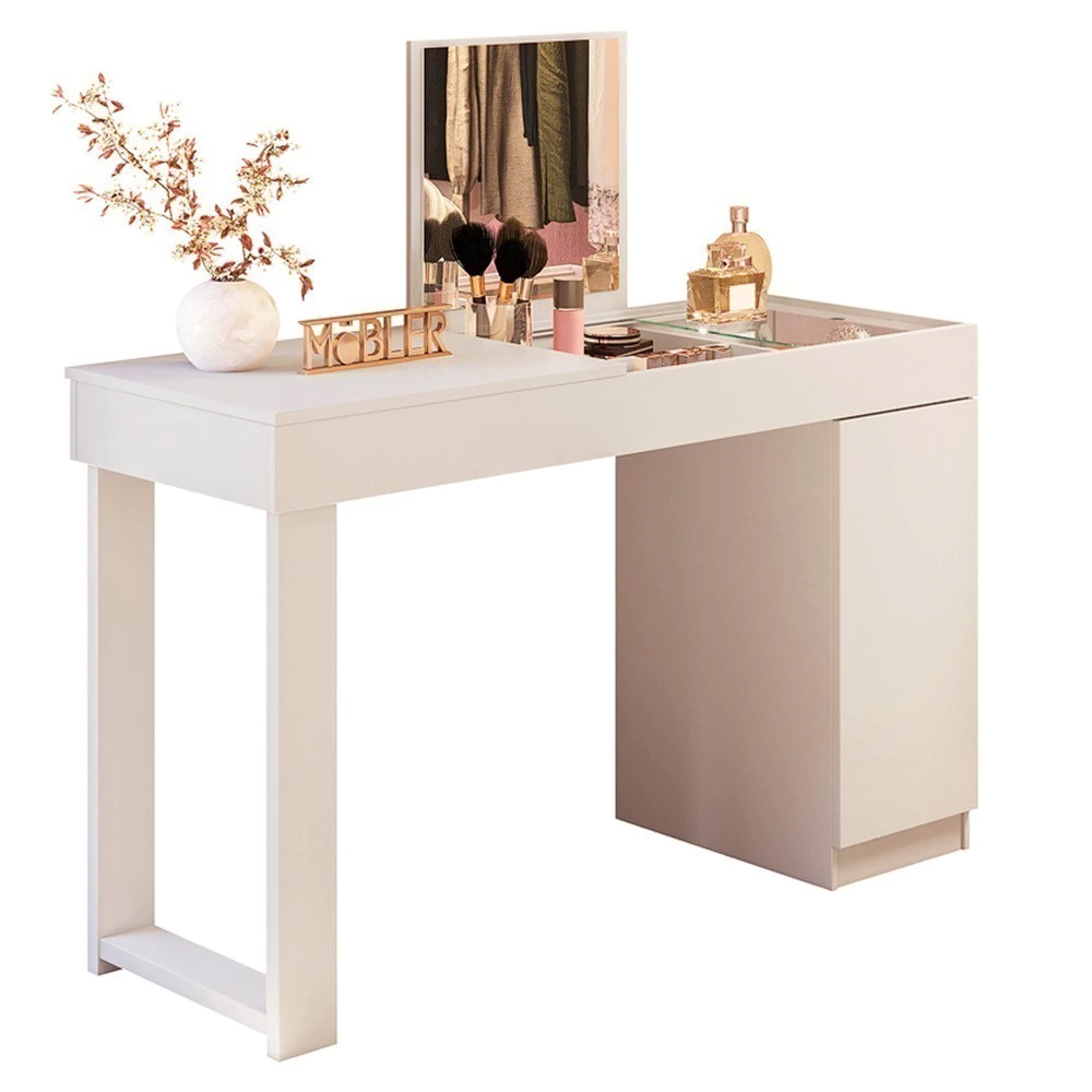 O amplo tampo proporciona espaço para organizar maquiagens, perfumes e acessórios, enquanto as gavetas espaçosas garantem praticidade no dia a dia. Seu espelho com design elegante realça ainda mais o ambiente e torna o momento de autocuidado mais agradável.