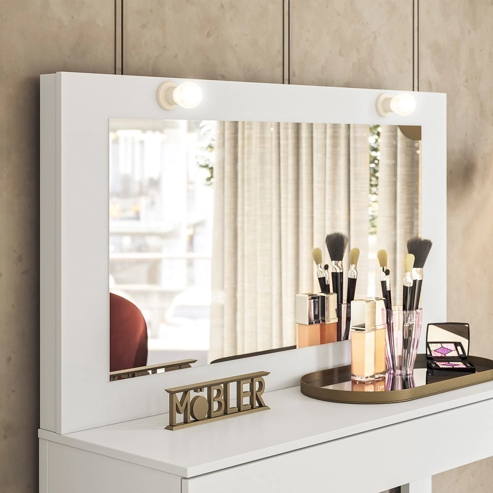 Seu tampo amplo e duas gavetas espaçosas oferecem o espaço ideal para guardar maquiagens, perfumes e acessórios, mantendo tudo sempre organizado. O espelho com moldura sofisticada adiciona um toque de requinte ao ambiente, valorizando ainda mais o visual do cômodo.
