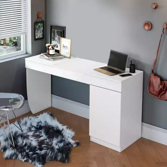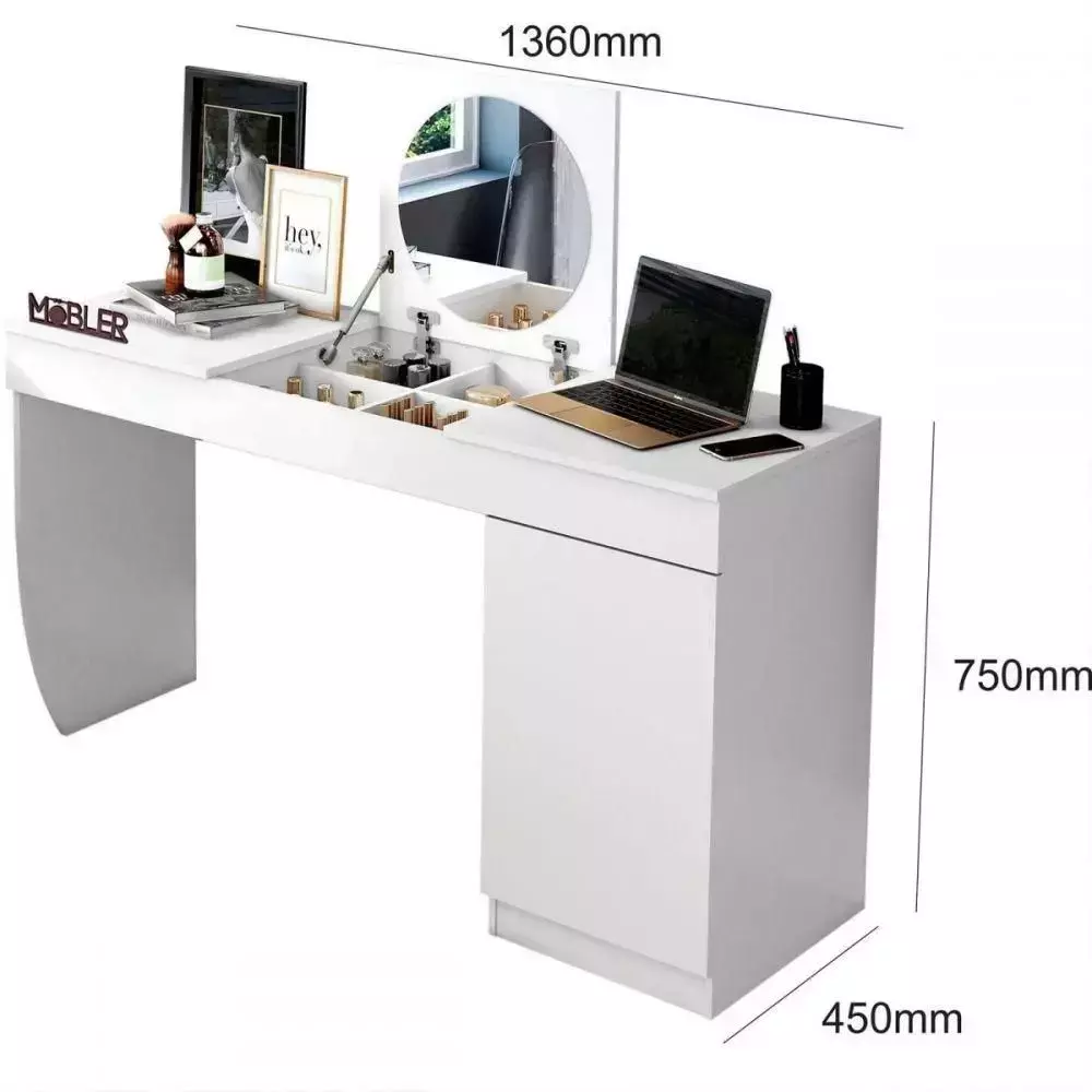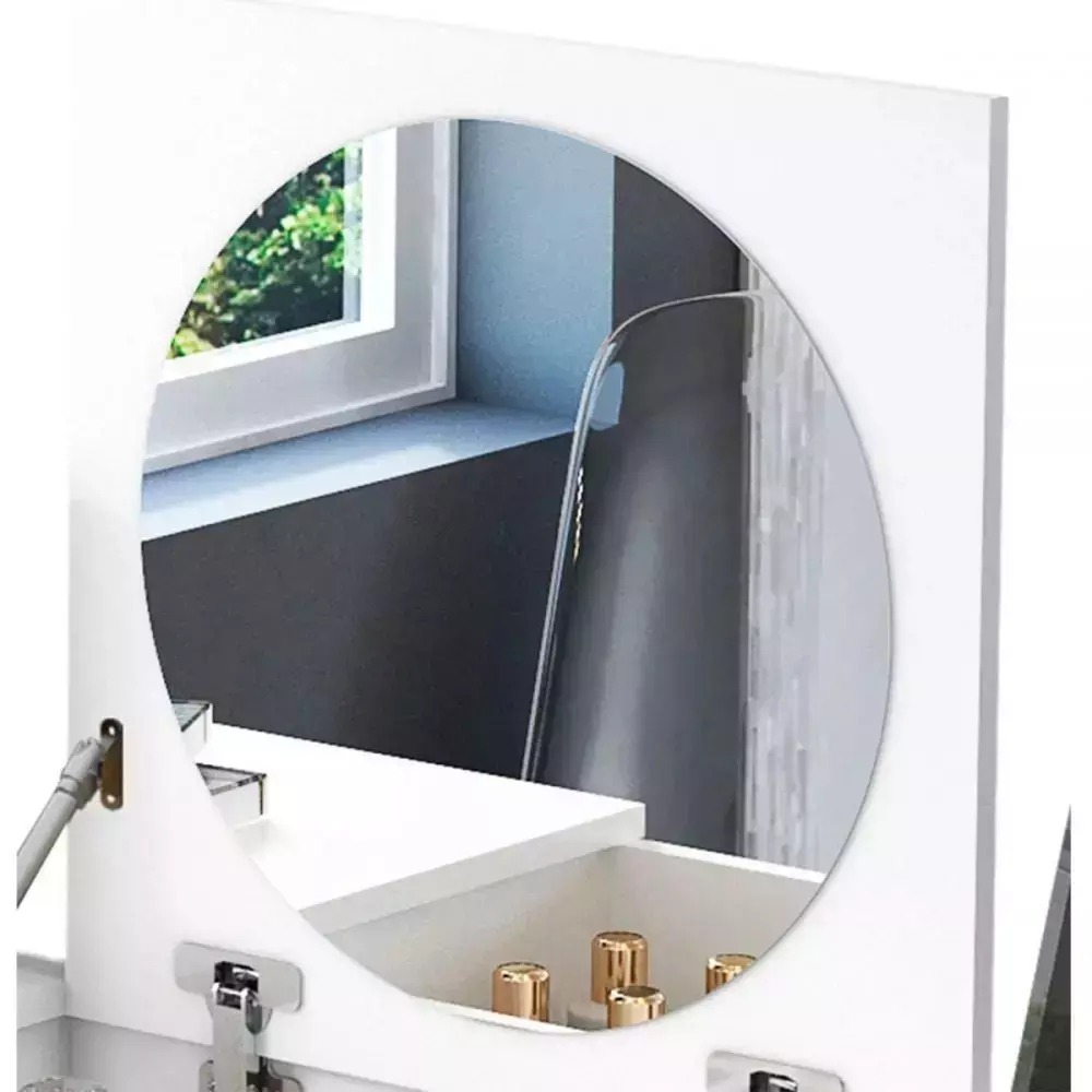 Com tampo basculante equipado com pistão a gás, ela se transforma em poucos segundos: de escrivaninha para penteadeira. O nicho interno acomoda maquiagem, acessórios ou objetos pessoais com facilidade, enquanto o espelho redondo já integrado deixa tudo mais prático.