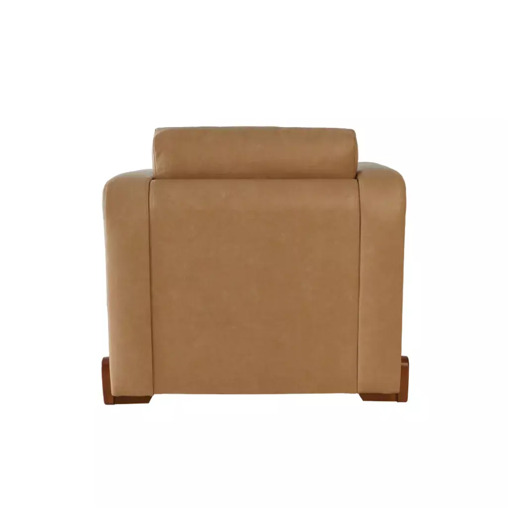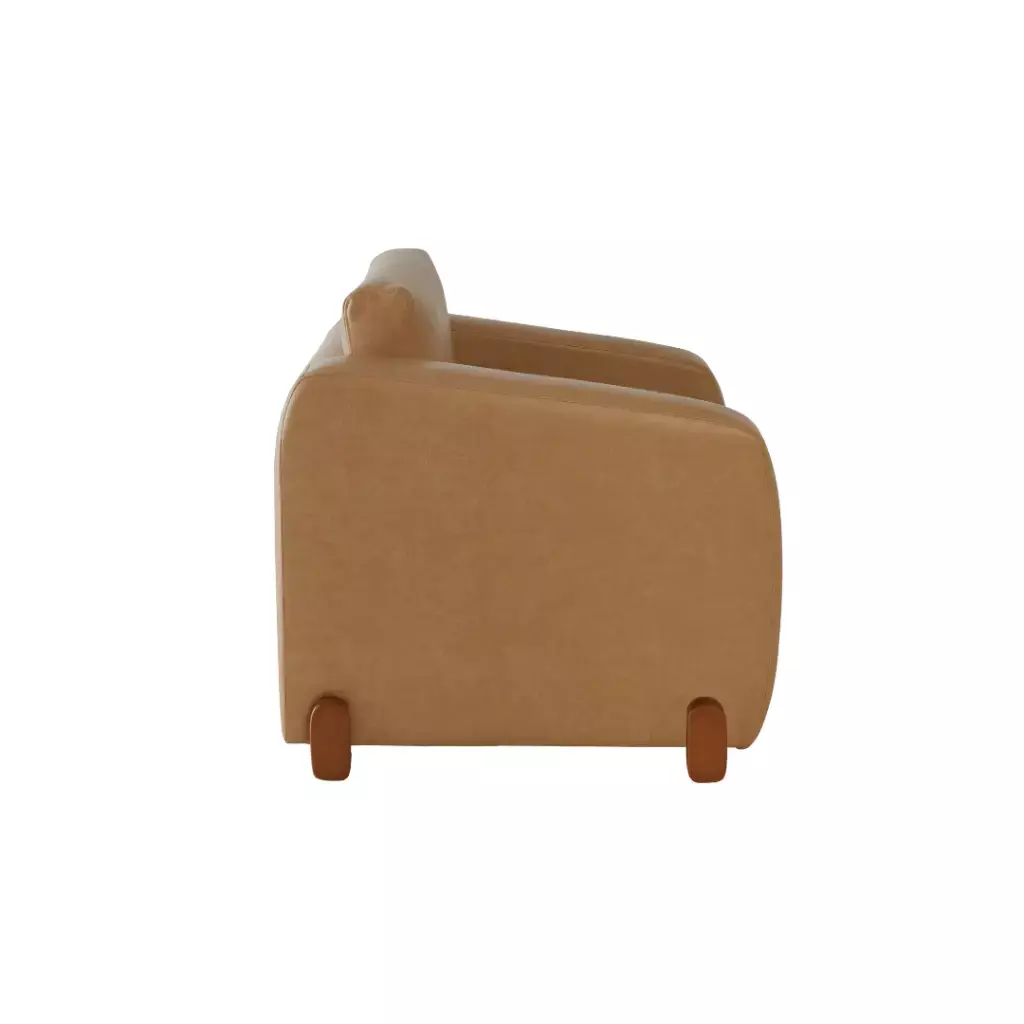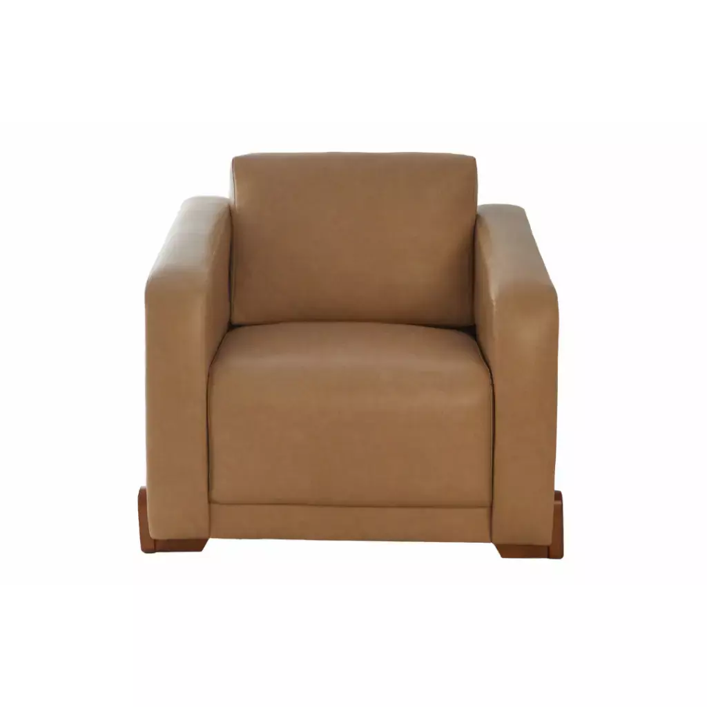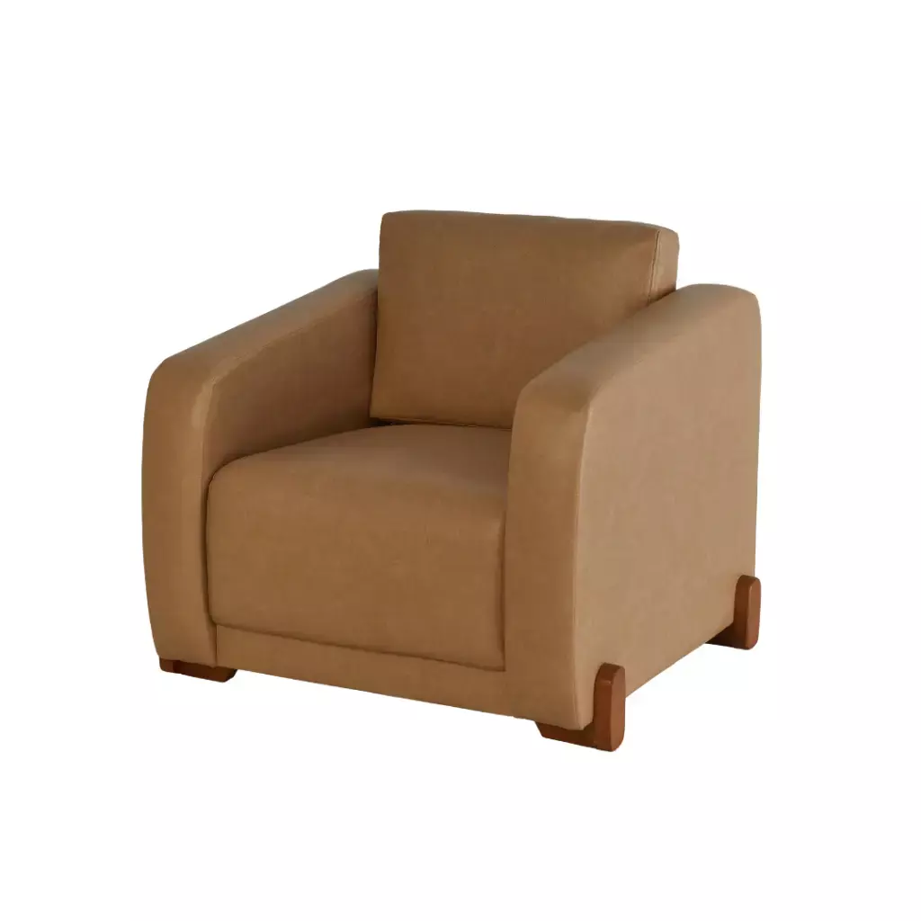O encosto conta com almofada solta recheada com flocos de espuma e fibra de poliéster siliconada, proporcionando uma sensação macia ao toque. Os braços também são compostos por espuma D33, e os pés em madeira maciça garantem firmeza e um acabamento elegante ao ambiente.
