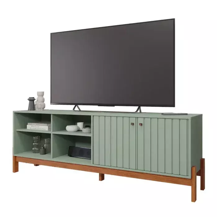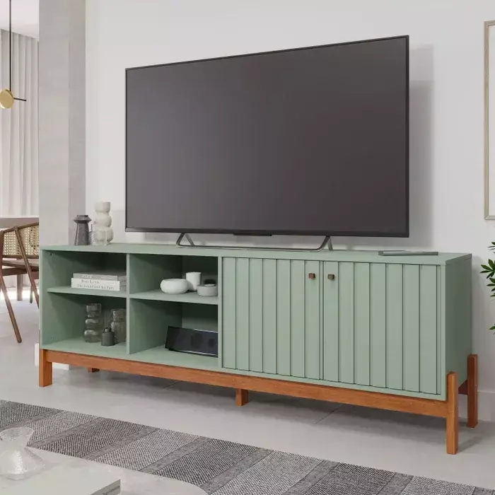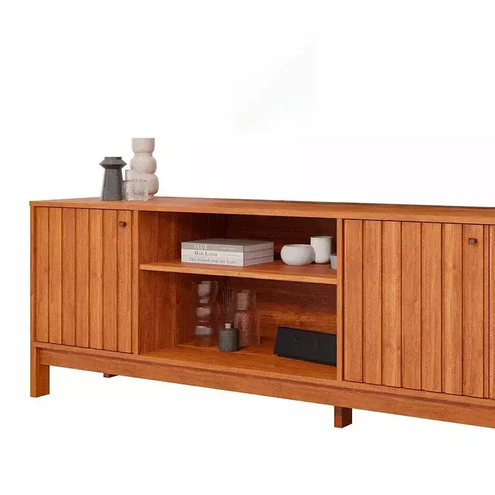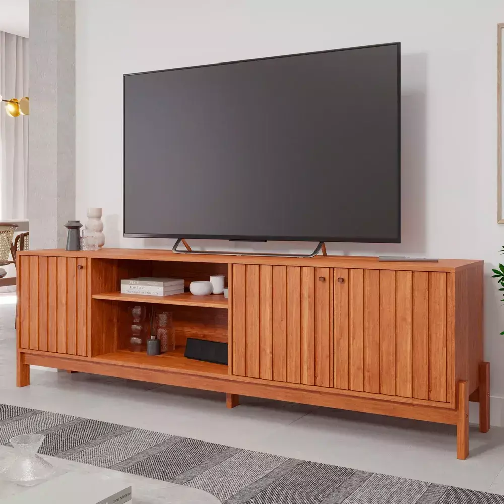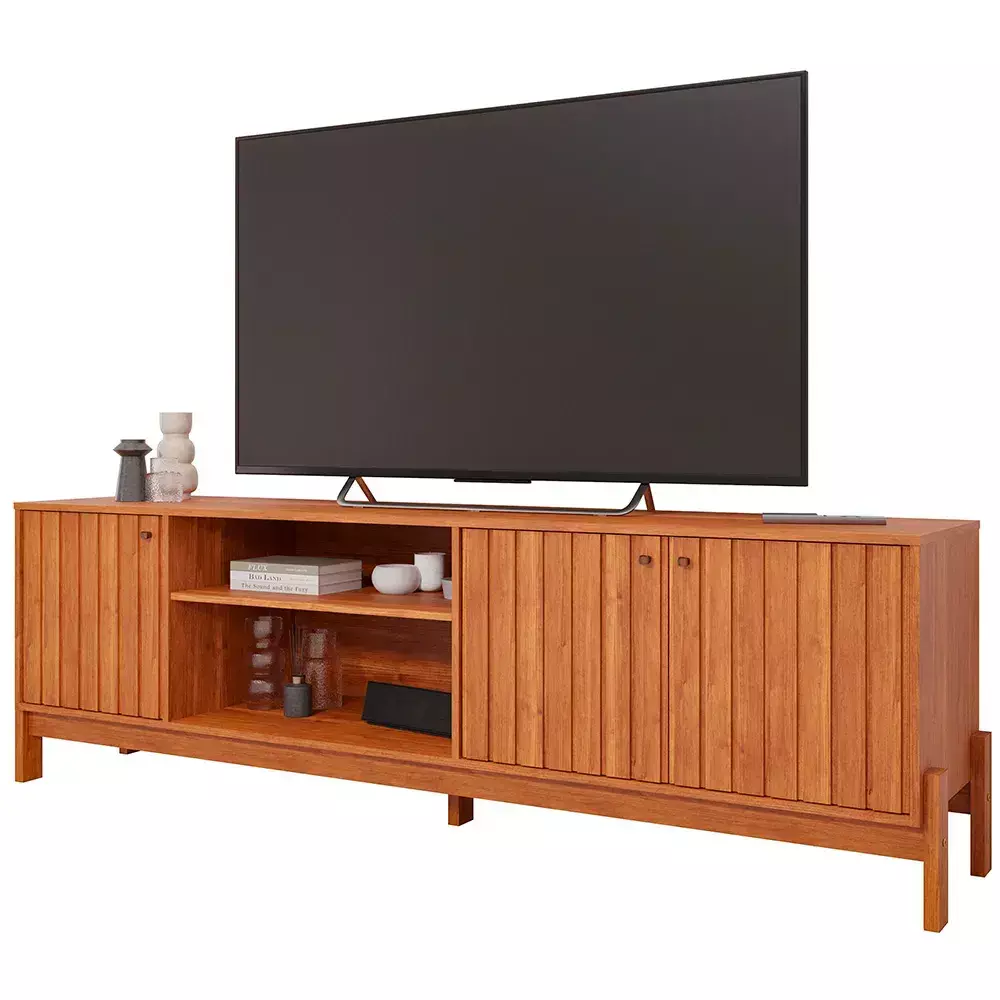 Com quatro portas equipadas com dobradiças de 35 mm e fechamento suave, ele oferece amplo espaço interno para manter eletrônicos e objetos organizados. Os pés em MDF de 25 mm completam o conjunto com firmeza e equilíbrio.