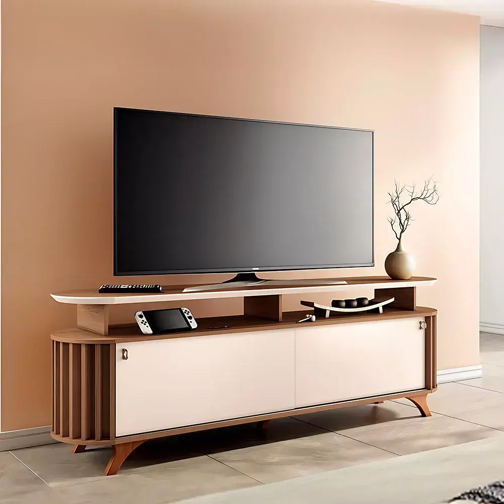 Produzido em MDP e MDF de 15mm e 18mm, o móvel conta com tampo chanfrado em PU Off White, pés em madeira maciça envernizada e laterais arredondadas que suavizam o visual. Seu trilho em alumínio proporciona deslizamento suave das portas, garantindo praticidade e durabilidade no uso diário.