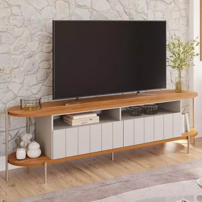 Produzido em MDF com pintura UV semi-fosca, ele se destaca pelo design moderno com tampo arredondado, porta basculante, gavetão espaçoso e quatro nichos versáteis, ideais para eletrônicos e itens decorativos.