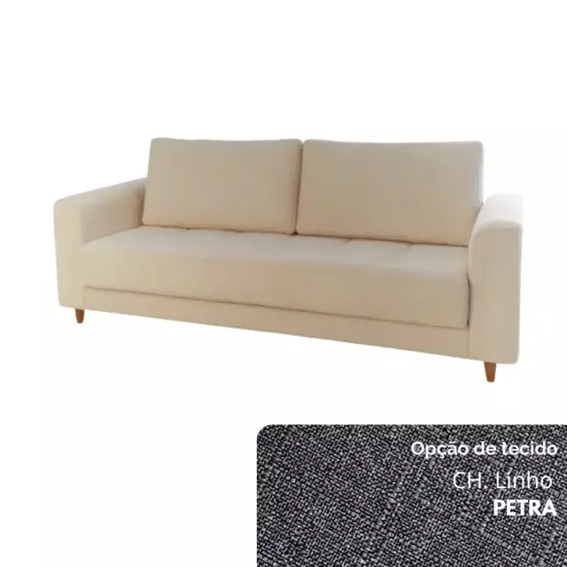 O assento é produzido em espuma D33 com camada de espuma HR, combinando firmeza e maciez. Conta também com fibra de poliéster siliconada, molas espirais e percintas elásticas, garantindo resistência e durabilidade. O encosto é composto por almofadas soltas em fibra de poliéster siliconada, oferecendo conforto e fácil manutenção.