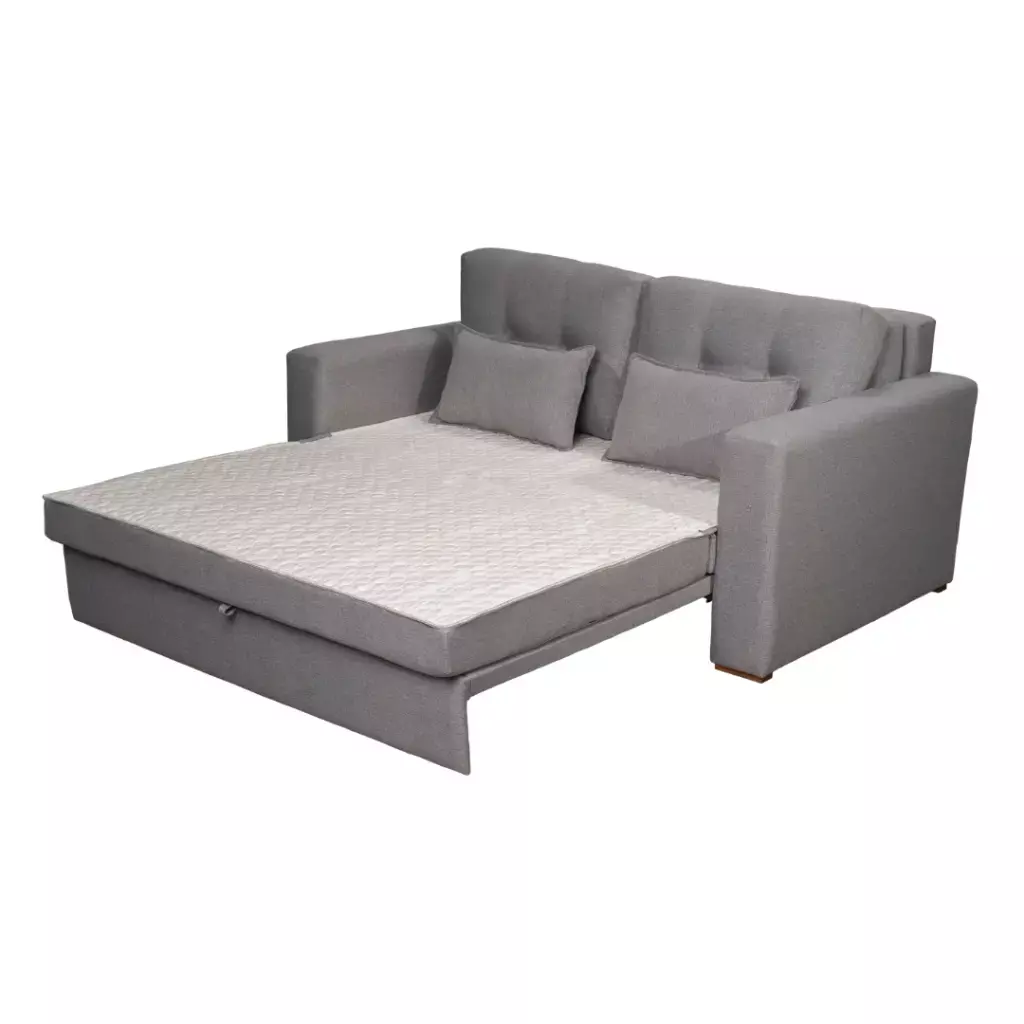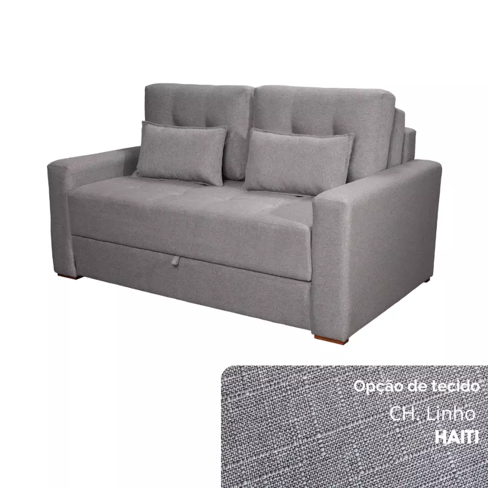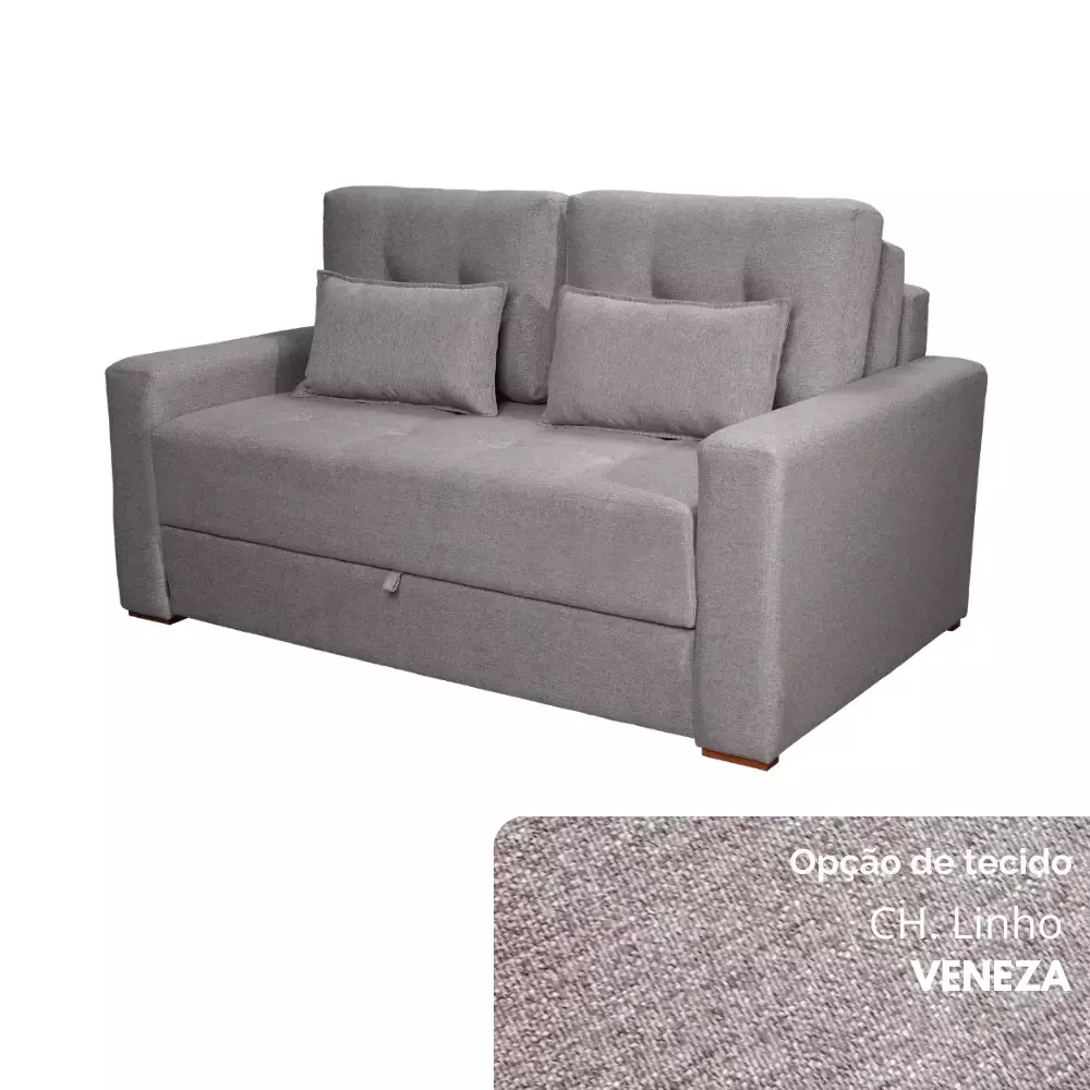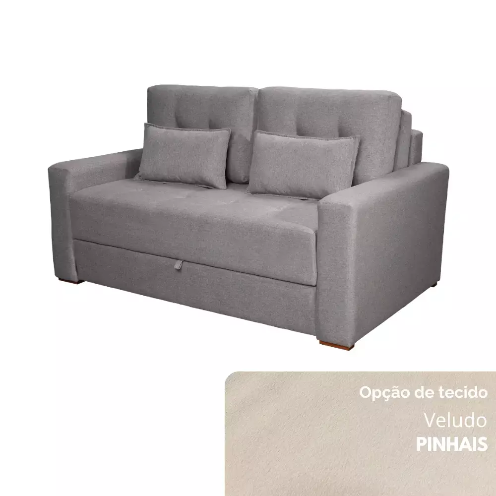 O assento se transforma em colchão confeccionado em espuma D33, que garante o equilíbrio ideal entre maciez e firmeza. Já o encosto conta com duas almofadas soltas em espuma D28, duas em fibra de poliéster siliconada e duas almofadas “rinheiras”, proporcionando conforto ajustável e apoio extra.
