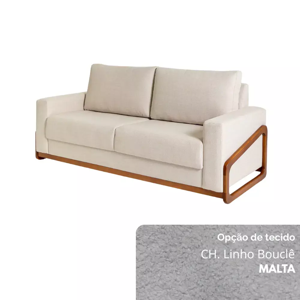 O encosto e os braços, confeccionados em espuma D33 e acompanhados de almofadas em fibra de poliéster siliconada, oferecem apoio confortável e adaptável ao corpo. O acabamento é valorizado pelos pés, rodapé e laterais em madeira maciça, que conferem elegância e robustez ao conjunto.