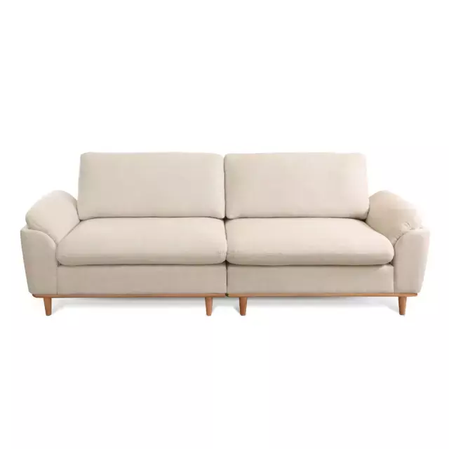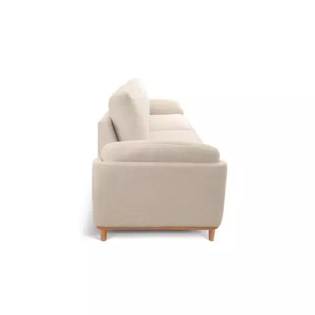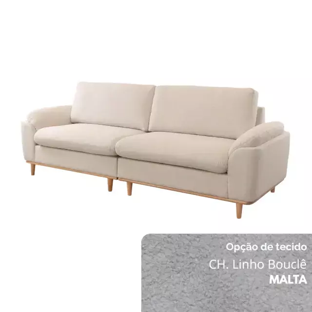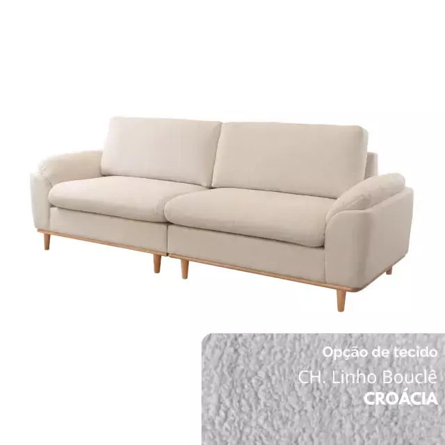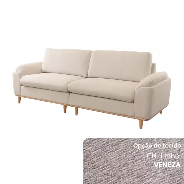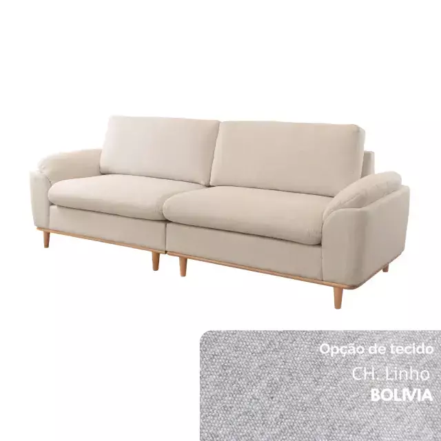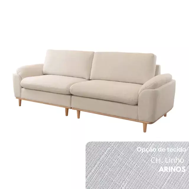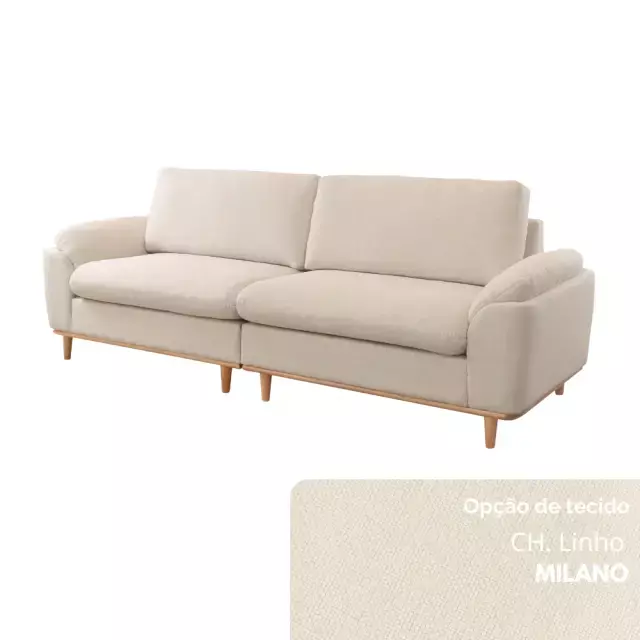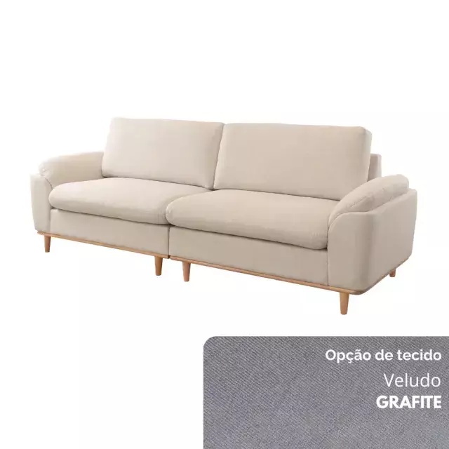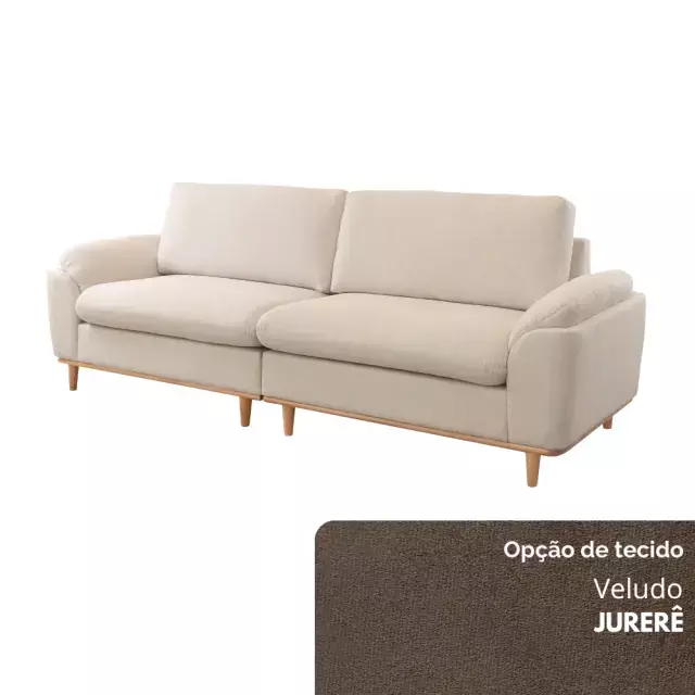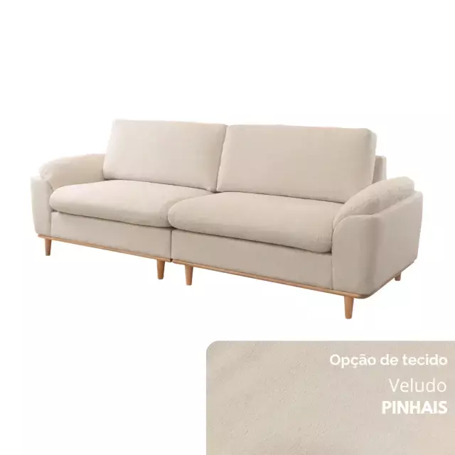 Seu assento conta com molas ensacadas e espuma D30 Soft, garantindo excelente sustentação e maciez. O encosto, formado por almofadas soltas em fibra de poliéster siliconada, oferece apoio macio e acolhedor. Os braços, confeccionados em flocos de espuma com camada de fibra siliconada, proporcionam toque suave, enquanto os pés em madeira maciça — disponíveis em diferentes tonalidades — completam o visual com elegância natural.
